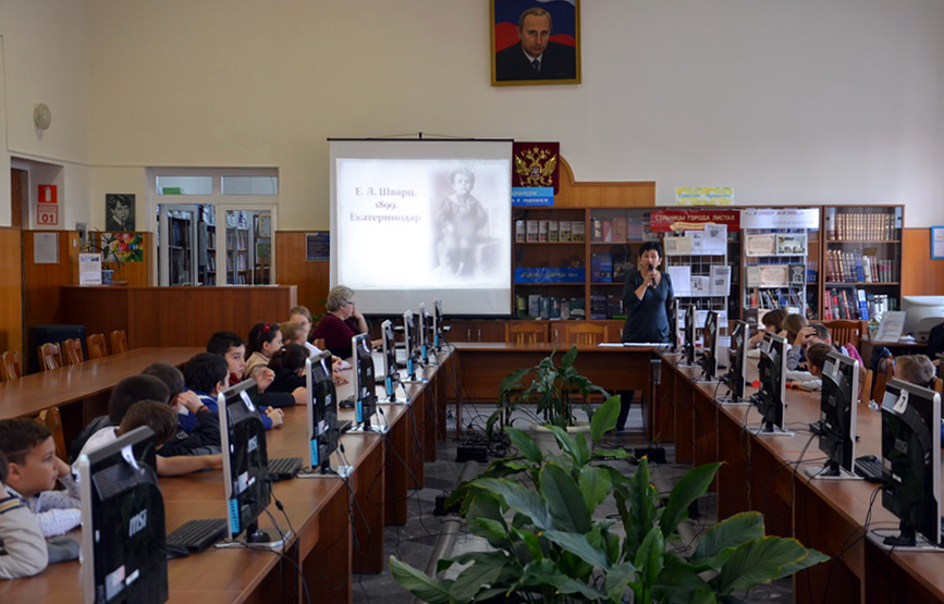 Участниками проекта «Майкопчанин Евгений Шварц» (https://www.youtube.com/watch?v=NBz-hbqMDU4) стали ученики начальной школы «Глобус». Познакомившись с проектами Научной библиотеки МГТУ на фестивале науки, преподаватели школы «Глобус» обратились в библиотеку с просьбой расширить возрастной диапазон участников проекта и включить в него учащихся начальной школы. 11 ноября 2016 г. в читальном зале НБ МГТУ состоялся литературный утренник, на котором ребята познакомились с творчеством Евгения Шварца, посмотрели отрывки из фильмов по его сценариям, ответили на вопросы викторины. Самые активные, внимательные, любознательные получили памятную грамоту, разработанную специально к этому утреннику. Просмотров: 3517 Назад |