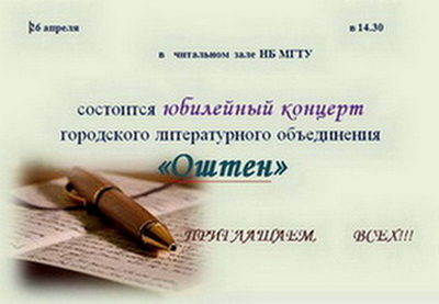 «Оштену» в 2017 г. исполнилось 30 лет. Руководитель объединения - Кирилл Анкудинов рассказал об истории создания литературного объединения, сборниках, которые были выпущены за тридцать лет, достижениях оштеновцев – поэтов и прозаиков. Практически каждый из пришедших в «Оштен» в 80-е, 90-е, нулевые стал автором собственного сборника, а многие – сборников, стихов и прозы. Оштеновцы публикуются в известных Российских журналах, участвуют в литературных фестивалях... О том, что «Оштен» - это особый микромир, творческое братство, семья, стало понятно, когда зазвучали стихи и песни... На творческой встрече, организованной Научной библиотекой МГТУ, присутствовали студенты инженерно-экономического, технологического, экологического, аграрного факультетов, факультета управления. От читателей и сотрудников Научной библиотеки МГТУ литературному объединению был преподнесен поздравительный адрес. Фото отчет можно увидеть на сайте НБ МГТУ в разделе «Фотоальбом» - ОТКРЫТЬ. ~~~~~~~~~~~~~~~~~~~~~~~~~~~~~~~~~~~~~~~~~~~~~